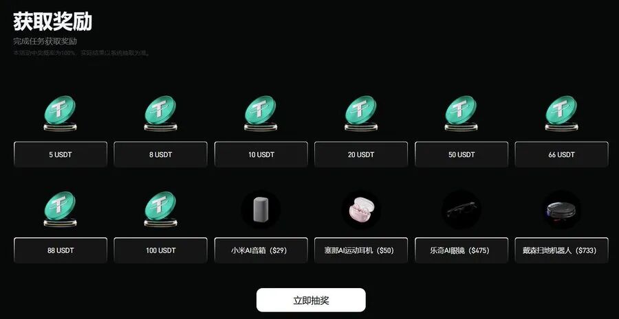 上面是这次活动的奖池,没有老演员“谢谢参与”,最次最次也能抽到5usdt,据说50u往上的奖池也不少。门槛极低,完成 KYC 就能抽 1 次,再完成基础的充值交易任务还能获得额外抽奖机会。最逆天的是前面那些实物大奖,也能直接按官方价格折现成u,不用担心抽的东西没有用烂在手里。